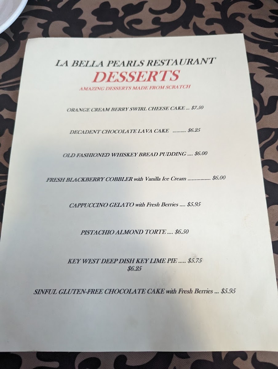 Be sure to leave room for dessert, as La Bella Pearl's offers a mouthwatering selection that includes the Orange Cream Berry Swirl Cheese Cake at $7.50 and the decadent Chocolate Lava Cake. Unique options like the Sinful Gluten-Free Chocolate Cake ensure that everyone can indulge.